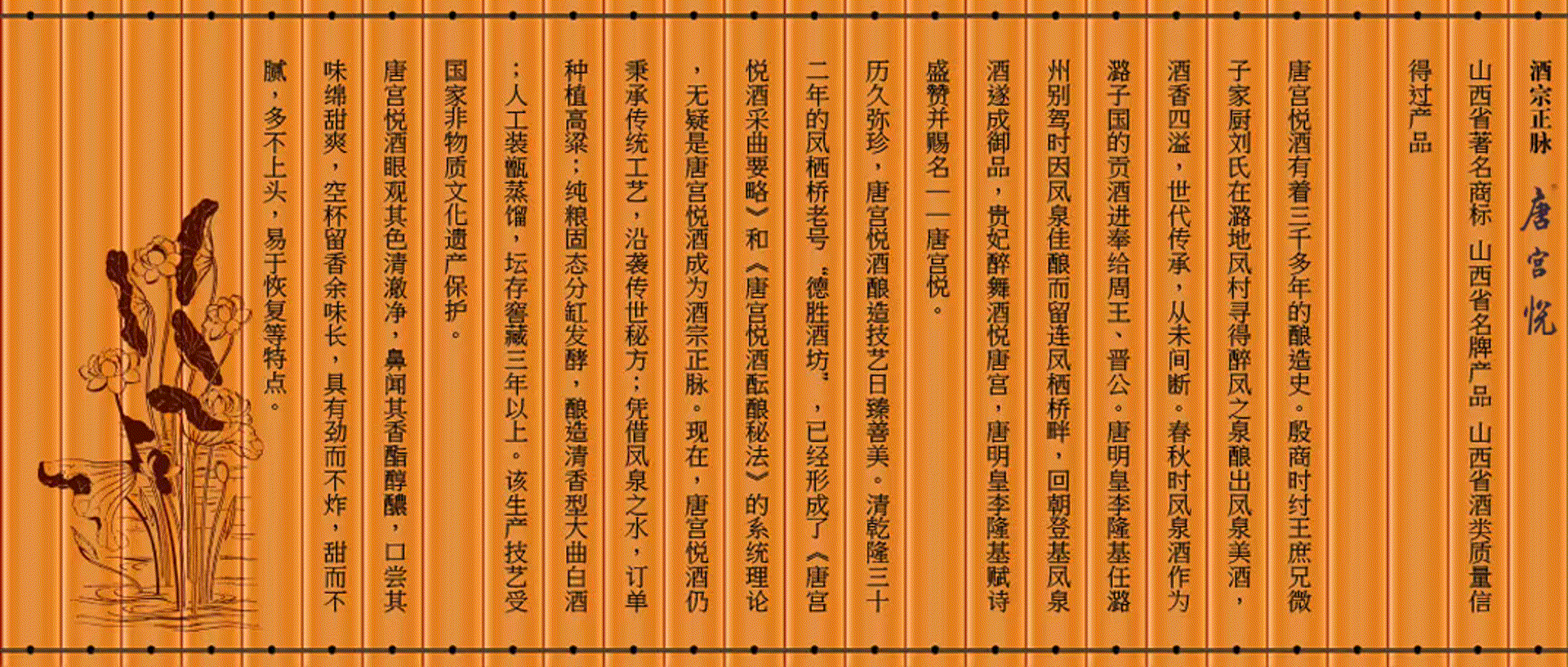鳳棲橋釀業(yè)有限公司歷史悠久。從殷商微子家廚劉氏尋鳳泉釀酒至今,已有三千多年釀造史。劉氏后裔代傳代善, 才有唐明皇李隆基賜名“唐宮悅”,到清乾隆三十二年的鳳棲橋老號“德勝酒坊”已形成了《唐宮悅酒采曲要略》和《唐宮悅酒醞釀秘法》的系統(tǒng)理論的系統(tǒng)理論,直至建國初期的一九五二年才被當時的潞城邊區(qū)酒坊所接管,一九七四年改邊區(qū)酒坊成立國營潞城縣酒廠,二00六年改制為現(xiàn)公司公司地處晉冀豫三省通衢素有“商賈云集旱馬頭”美譽的微子古鎮(zhèn)……【詳細】 |